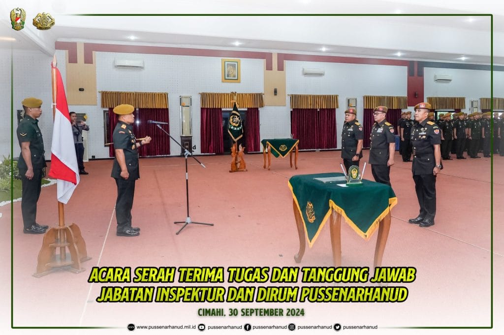 Danpussenarhanud Mayjen TNI Hari Arif Wibowo, S.I.P., M.Han. memimpin acara serah terima tugas dan tanggung jawab jabatan Inspektur dan Dirum Pussenarhanud pada hari Senin, 30 September 2024 di aula R. Harsoyo Pussenarhanud. Acara tersebut dihadiri oleh PJU Pussenarhanud beserta perwakilan Perwira, Bintara, Tamtama dan PNS Pussenarhanud serta Ketua Persit KCK Cabang XIX Pussenarhanud PG Mabesad Ibu Dian Hari Arif Wibowo beserta pengurus.