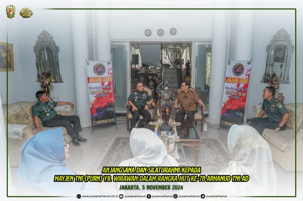 Danpussenarhanud Mayjen TNI Hari Arif Wibowo, S.I.P., M.Han. dan Ibu Ketua Persit Kartika Chandra Kirana Cabang XIX Pussenarhanud PG Mabesad Ibu Dian Hari Arif Wibowo didampingi Dirum Pussenarhanud beserta Istri melaksanakan kegiatan anjangsana dan silarurahmi kepada Mayjen TNI (Purn) YB. Wirawan dalam rangka HUT ke-78 Arhanud pada hari Selasa, 5 November 2024 di Jakarta.