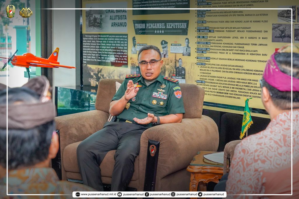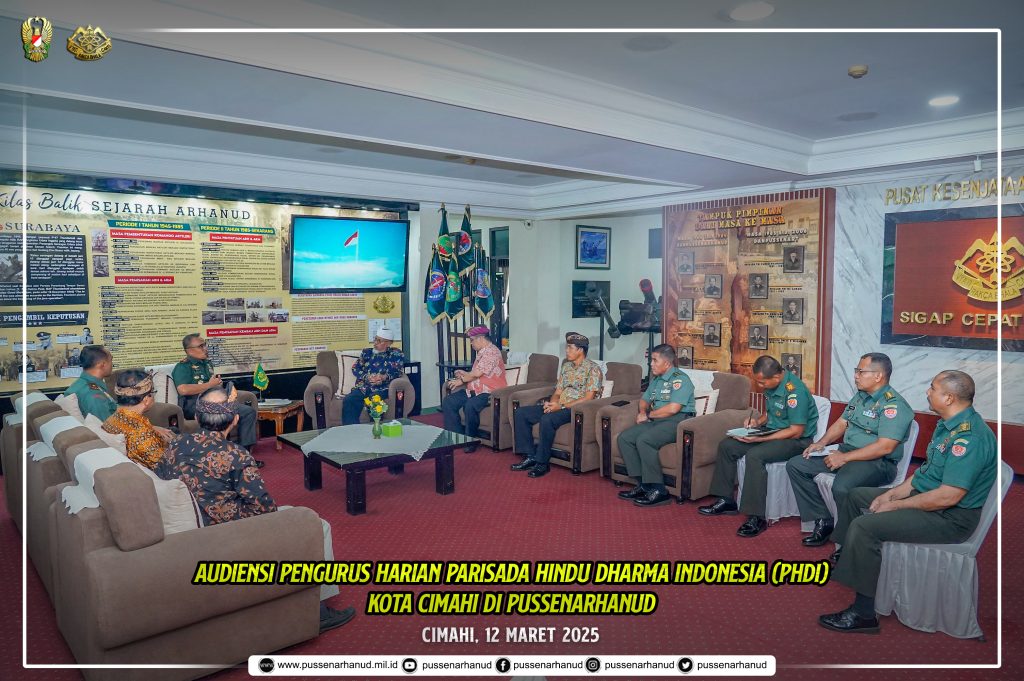 Danpussenarhanud Mayjen TNI Hari Arif Wibowo, S.I.P., M.Han. didampingi Wadan Pussenarhanud dan Dirum Pussenarhanud menerima audiensi dari Pengurus Harian Parisada Hindu Dharma Indonesia (PHDI) Kota Cimahi Brigjen TNI (Purn) I Putu Eka Asmara Putra beserta rombongan pada hari Rabu, 12 Maret 2025 bertempat di ruang lobby Pussenarhanud. Kegiatan audiensi membahas tentang rencana penyelenggaraan pawai budaya dan ogoh-ogoh yang akan dilaksanakan pada hari Ju’mat, 28 Maret 2025 dalam rangka menyambut perayaan Hari Suci Nyepi Tahun Baru Saka 1947. Menariknya, audiensi berlangsung tepat pukul 10.00 WIB, bertepatan dengan waktu menyanyikan lagu Indonesia Raya. Oleh karena itu, Danpussenarhanud beserta seluruh tamu yang hadir di ruang lobi Pussenarhanud turut serta menyanyikan lagu kebangsaan tersebut.