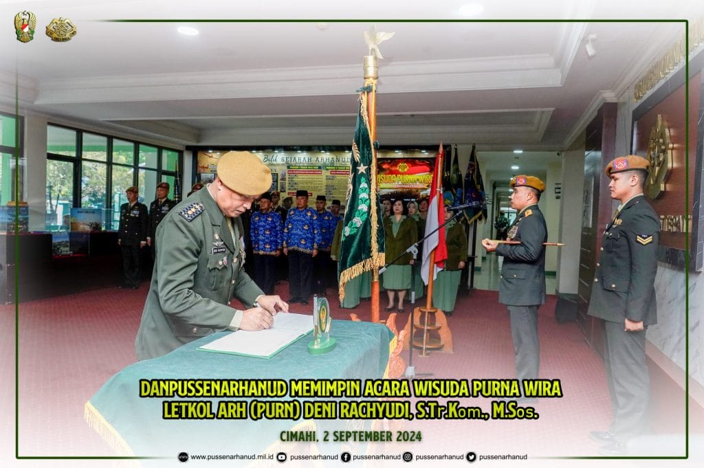 Danpussenarhanud Mayjen TNI Hari Arif Wibowo, S.I.P., M.Han. memimpin acara Wisuda Purna Wira Letkol Arh (Purn) Deni Rachyudi, S.Tr.Kom., M.Sos. acara tersebut dihadiri oleh Ketua Persit KCK Cabang XIX Pussenarhanud PG Mabesad Ibu Dian Hari Arif Wibowo, para PJU Pussenarhanud beserta istri dan perwakilan Perwira, Bintara, Tamtama dan PNS Pussenarhanud pada hari Senin, 2 September 2024 di Ruang Lobby Mapussenarhanud.