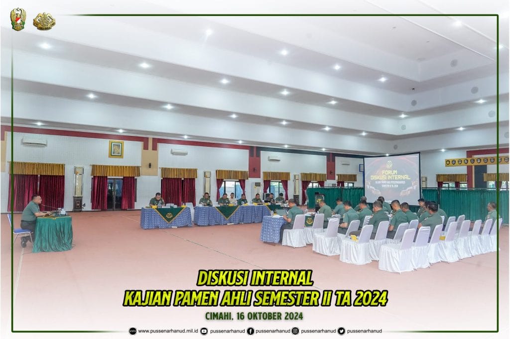 Irpussenarhanud Brigjen TNI M.F.R. Nasution memimpin kegiatan diskusi internal kajian Pamen Ahli Semester II TA 2024 pada hari Rabu, 16 Oktober 2024 di Aula R. Harsoyo Pussenarhanud.