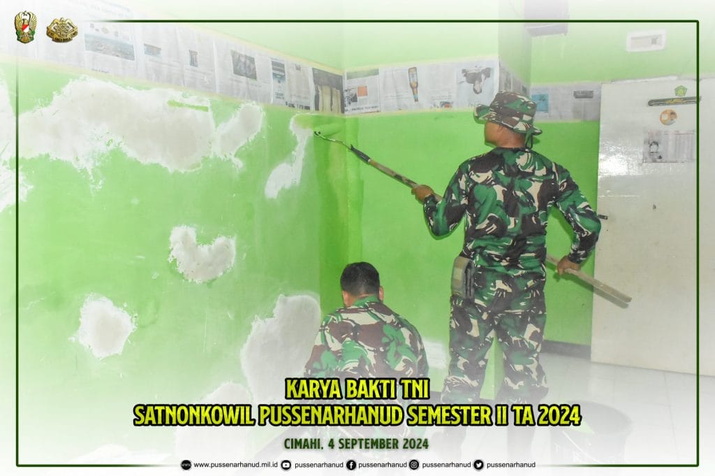 Personel Pussenarhanud melaksanakan kegiatan pengecatan Mushola Al-Ikhlas RT. 005 RW. 005 Kel. Citeureup Kec. Cimahi Utara Kota Cimahi pada hari Rabu, 4 September 2024 dalam rangka Karya Bakti TNI Satnonkowil Pussenarhanud Semester II TA 2024.