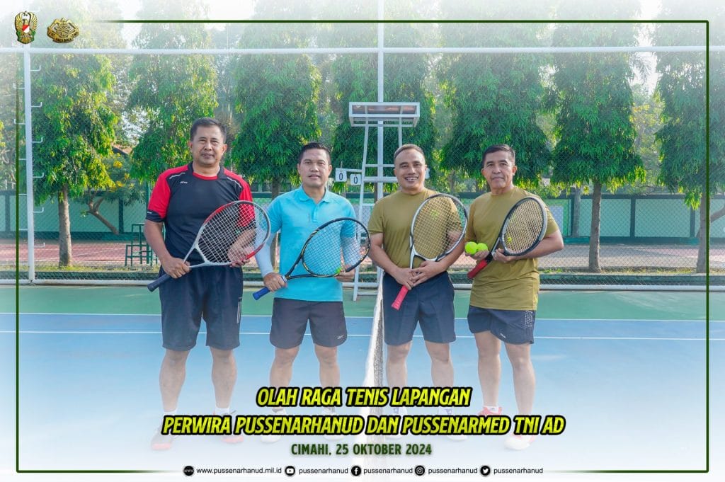 Danpussenarhanud Mayjen TNI Hari Arif Wibowo, S.I.P., M.Han. beserta PJU dan Perwira Pussenarhanud melaksanakan olah raga tenis lapangan bersama Danpussenarmed Mayjen TNI Agus Hadi Waluyo, S.A.P., M.M., CHRMP. beserta PJU dan Perwira Pussenarmed pada hari Jumat, 25 Oktober 2024 di lapangan tenis Pussenarhanud.