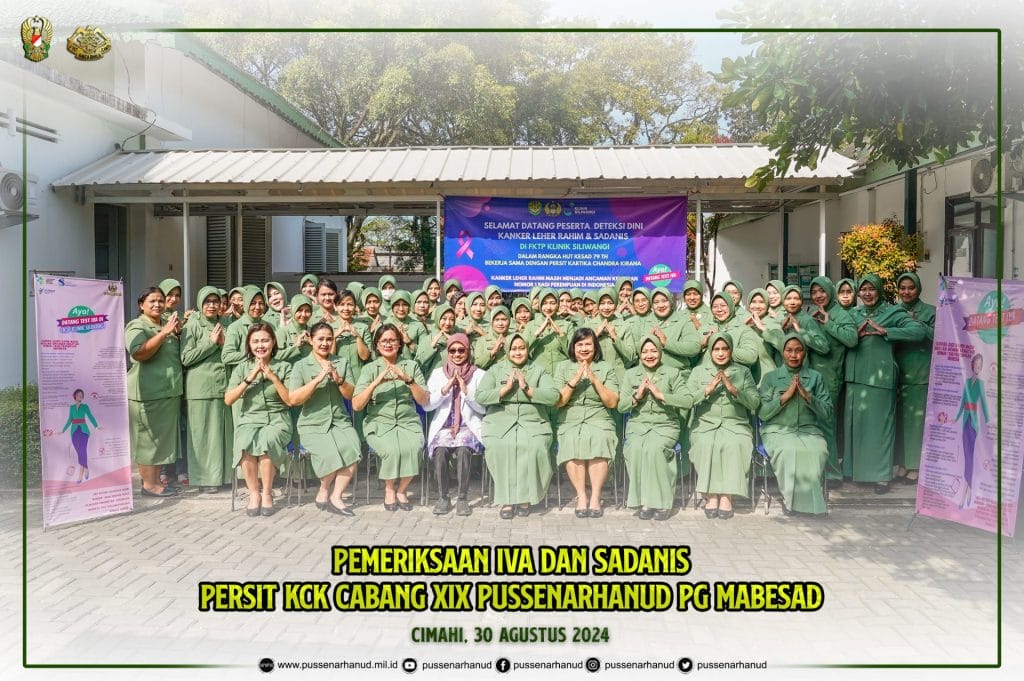 Ketua Persit Kartika Chandra Kirana Cabang XIX Pussenarhanud PG Mabesad Ny. Dian Hari Arif Wibowo beserta pengurus melaksanakan pemeriksaan kesehatan IVA dan SADANIS bertempat di Kantor Kesehatan Kodim 0609/Cimahi dalam rangka upaya deteksi dini dan pencegahan kanker bagi anggota Persit KCK Cabang XIX Pussenarhanud PG Mabesad.
