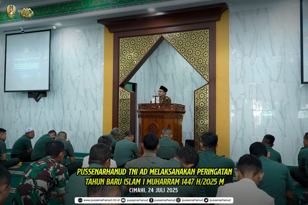 Pussenarhanud TNI AD melaksanakan peringatan Tahun Baru Islam 1 Muharram 1447 H/2025 M dengan menghadirkan penceramah Ustadz Syahidin, Lc,MA.,(Ketua MUI Cimahi Utara) bertempat di Masjid Daarul Muttaqiin Mapussenarhanud, Cimahi, Jawa Barat, Kamis (24/07/2025).