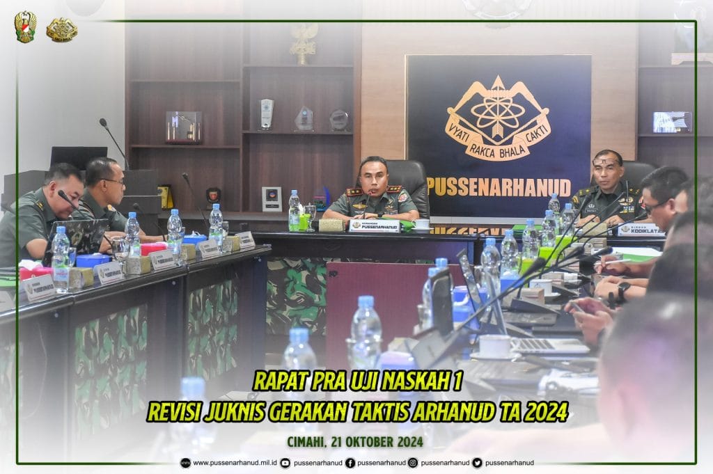 Danpussenarhanud Mayjen TNI Hari Arif Wibowo, S.I.P., M.Han. beserta PJU Pussenarhanud dan tim pokja melaksanakan kegiatan rapat Pra Uji Naskah 1 Revisi Juknis Gerakan Taktis Arhanud TA 2024 bertempat di Ruang Rapat Pussenarhanud pada hari Senin, 21 Oktober 2024. Acara tersebut juga dihadiri oleh Dirdok Kodiklat TNI AD Brigjen TNI Teguh Pudji Rahardjo beserta Tim.