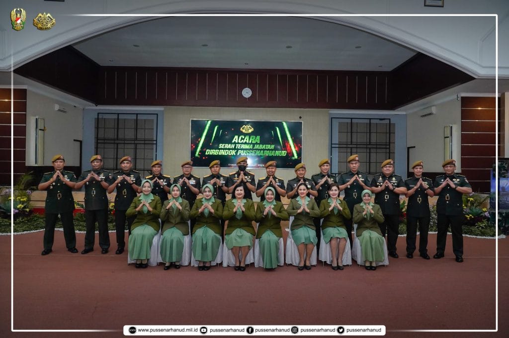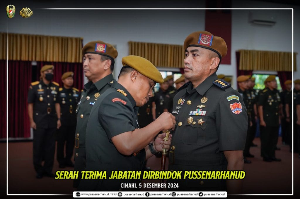 Danpussenarhanud Mayjen TNI Hari Arif Wibowo, S.I.P., M.Han. beserta PJU Pussenarhanud dan perwakilan anggota Pussenarhanud beserta Pengurus Persit Kartikan Chandra Kirana Cabang XIX Pussenarhanud PG Mabesad melaksanakan kegiatan acara serah terima jabatan Dirbindok Pussenarhanud dari Kolonel Arh M. Desi Ariyanto kepada Kolonel Arh Rudi Ragil Sang Putra, S.Sos., M.Si. pada hari Kamis, 5 Desember 2024 bertempat di aula R. Harsoyo Pussenarhanud.