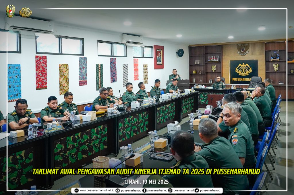 Danpussenarhanud Mayjen TNI Hari Arif Wibowo, S.I.P., M.Han. beserta para PJU dan Staf melaksanakan kegiatan taklimat awal pengawasan audit kinerja Itjenad TA 2025 di Pussenarhanud pada hari Senin, 19 Mei 2025 bertempat di ruang rapat Pussenarhanud, kegiatan ini juga diikuti oleh Danpusdik Arhanud dan Kabengpus Arhanud melalui Daring.