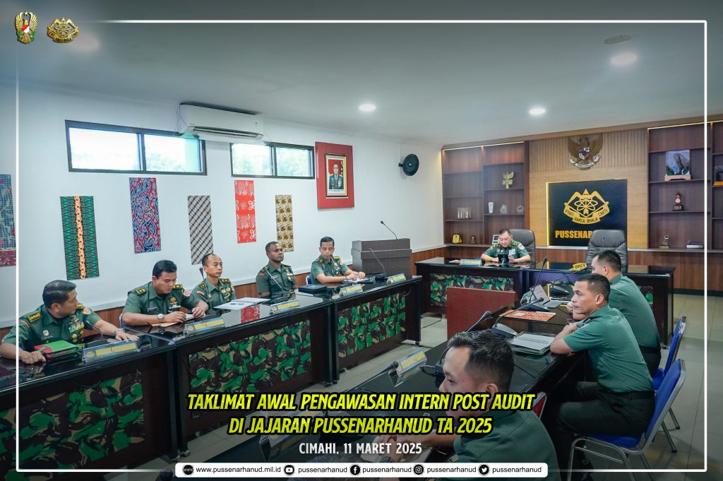 Inspektur Pussenarhanud Brigjen TNI M.F.R. Nasution memimpin acara taklimat awal pengawasan intern post audit di jajaran Pussenarhanud TA 2025 pada hari Selasa, 11 Maret 2025 bertempat di ruang rapat Pussenarhanud. Acara ini dihadiri secara tatap muka oleh seluruh PJU Pussenarhanud dan perwakilan staf serta dihadiri secara virtual oleh Danpusdik Arhanud dan Kabengpus Arhanud beserta Staf, kegiatan dilanjutkan dengan pemeriksaan di Mapussenarhanud.