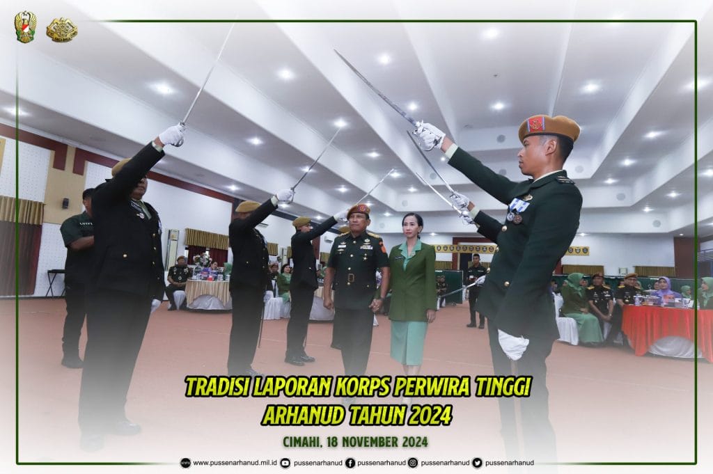 Danpussenarhanud Mayjen TNI Hari Arif Wibowo, S.I.P., M.Han. memimpin pelaksanaan Tradisi Laporan Korps Perwira Tinggi Arhanud Tahun 2024 pada hari Senin, 18 November 2024 di Aula R. Harsoyo Pussenarhanud.