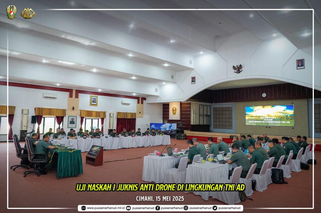 Wadanpussenarhanud Brigjen TNI I Gede Widiyana, S.H., M.Tr.(Han). beserta Dirdok Kodiklatad Brigjen TNI Teguh Pudji Rahardjo dan undangan melaksanakan kegiatan Uji Naskah I Juknis Anti Drone di lingkungan TNI AD pada hari Kamis, 15 Mei 2025 bertempat di aula R. Harsoyo Pussenarhanud.