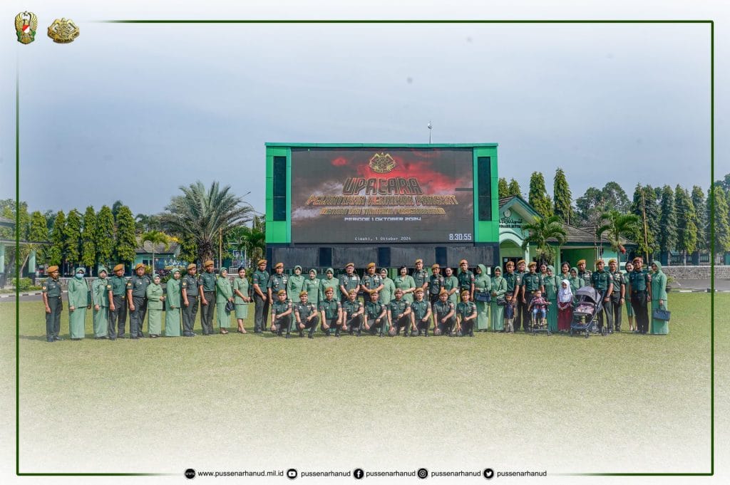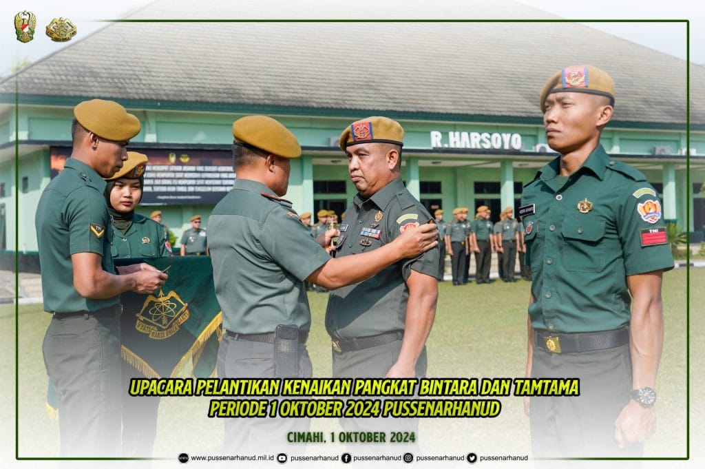 Danpussenarhanud Mayjen TNI Hari Arif Wibowo, S.I.P., M.Han. didampingi Ketua Persit KCK Cabang XIX Pussenarhanud PG Mabesad Ibu Dian Hari Arif Wibowo beserta PJU dan seluruh anggota Pussenarhanud melaksanakan Upacara Pelantikan Kenaikan Pangkat Bintara dan Tamtama Periode 1 Oktober 2024 Pussenarhanud pada hari Selasa, 1 Oktober 2024 di lapangan upacara Pussenarhanud.