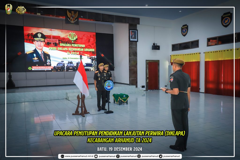 Wadanpussenarhanud Brigjen TNI I Gede Widiyana, S.H., M.Tr(Han). memimpin Upacara Penutupan Pendidikan Diklapa Kecabangan Arhanud TA 2024 pada hari Kamis, 19 Desember 2024 di aula A.H. Nasution Pusdikarhanud Batu Jawa Timur.