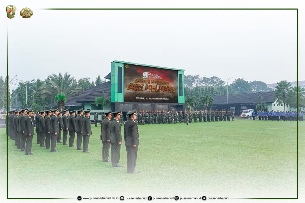 Danpussenarhanud Mayjen TNI Hari Arif Wibowo, S.I.P., M.Han. beserta PJU Pussenarhanud dan seluruh anggota Pussenarhanud melaksanakan kegiatan Upacara Peringatan Hari Pahlawan Tahun 2024 di lapangan upacara Pussenarhanud pada hari Minggu, 10 November 2024.